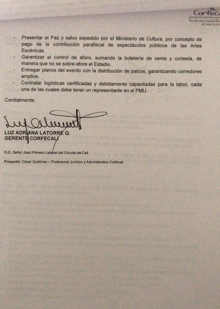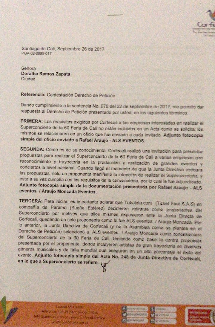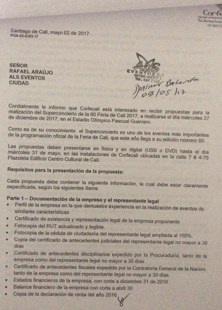 Compartimos con ustedes algunos de los requerimientos exigidos por Corfecali a las empresas invitadas a participar en la realización de Concierto de la 60 Feria de Cali, pero que la empresa elegida no cumple: