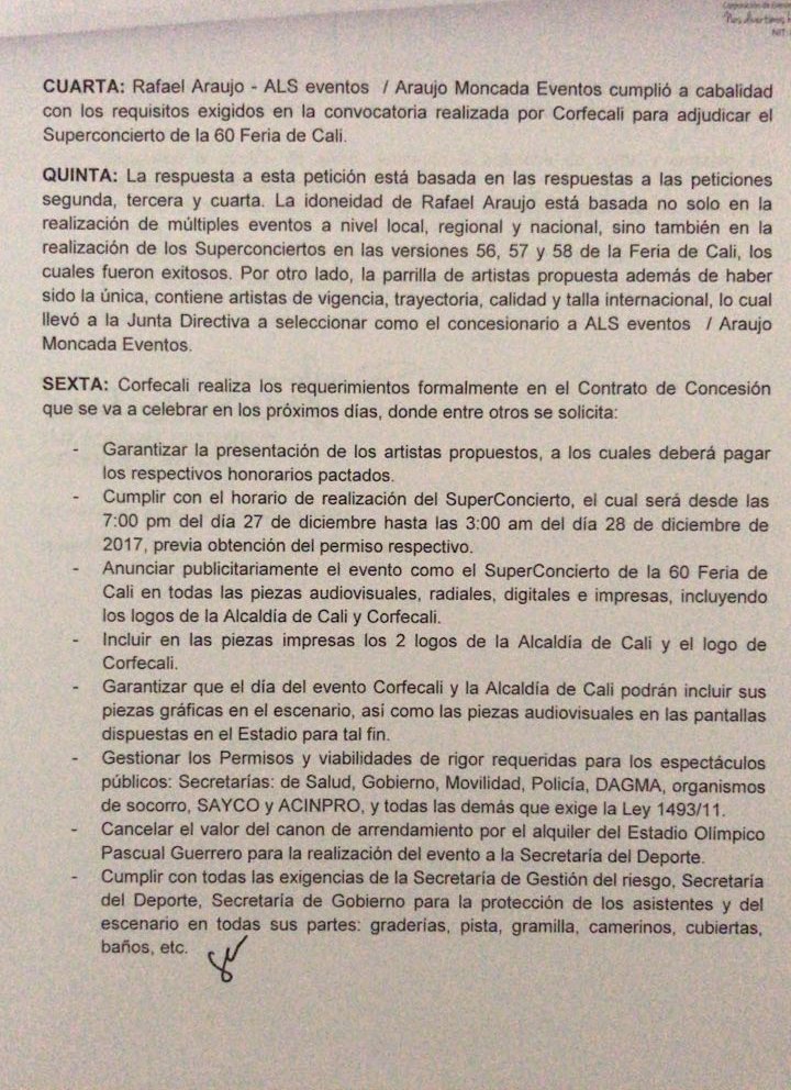 Corfecali, entidad contratada por la Alcaldía de Cali para para llevar a cabo el Superconcierto, realizó de manera irregular el contrato para llevar a cabo éste evento, ya que la convocatoria se realizó en forma diferente a la que le fue adjudicada al empresario Rafael Araujo quien involucró a la empresa A.M Eventos S.A.S identificada con Nit. 900.843.953-6, a la cual no está vinculado y no posee los requerimientos mínimos para manejar este tipo de contratos.
