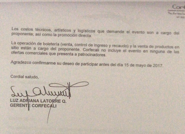 No obstante, lo que genera más dudas al respecto, es la forma como se realizó esta adjudicación y el manejo que se le ha dado a los recursos por parte de la señora Luz Adriana Latorre Directora de Corfecali, persona directamente encargada de otorgar dicha adjudicación y quien no ha podido explicar el ¿por qué tomó esa decisión? ¿Qué beneficios recibió? ¿Y bajo qué carácter se adjudicó este contrato? Lo que genera fuertes interrogantes.
